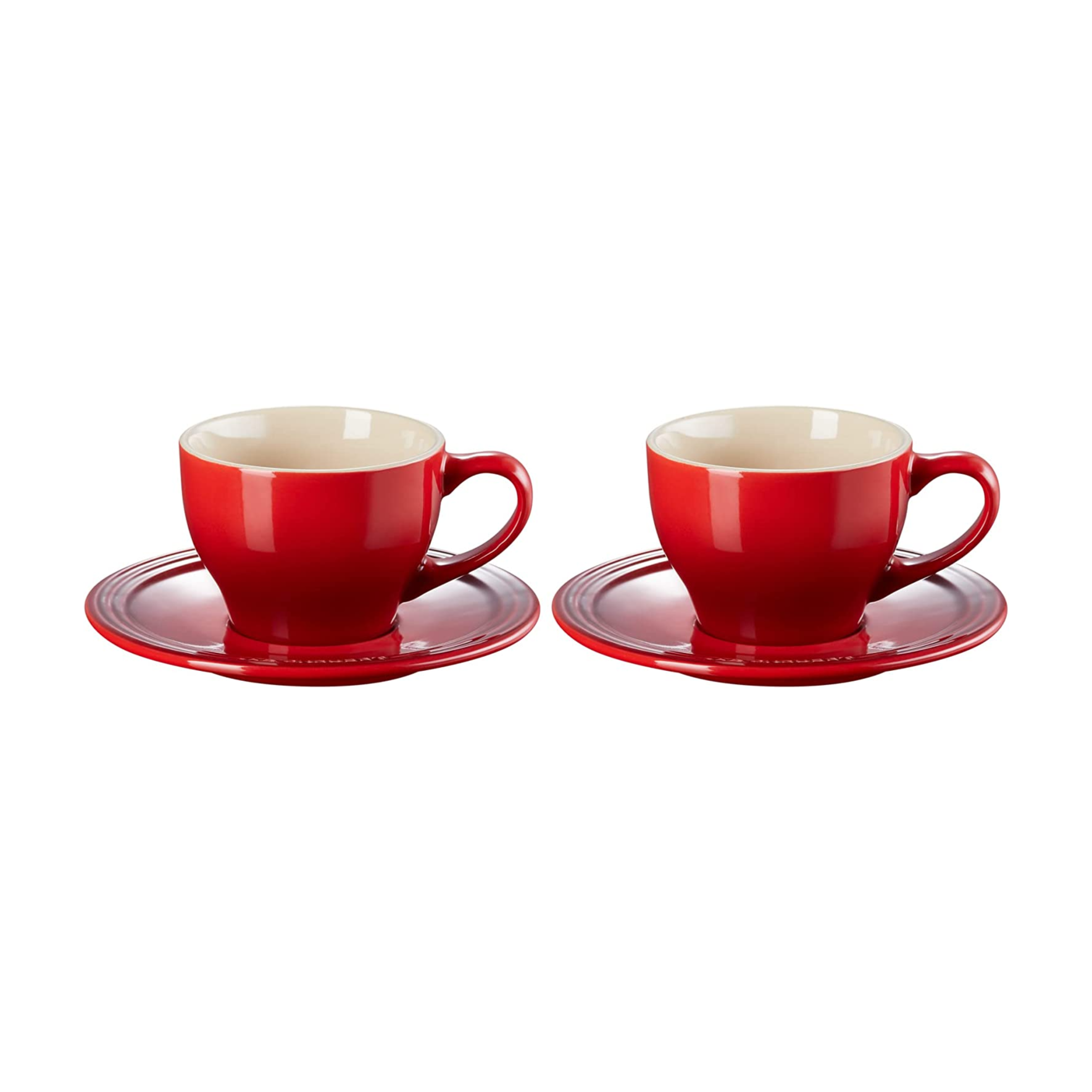 Set of 2 Cappuccino Cups and Saucers, 7 oz. each, in Cerise by Le Creuset Stoneware.