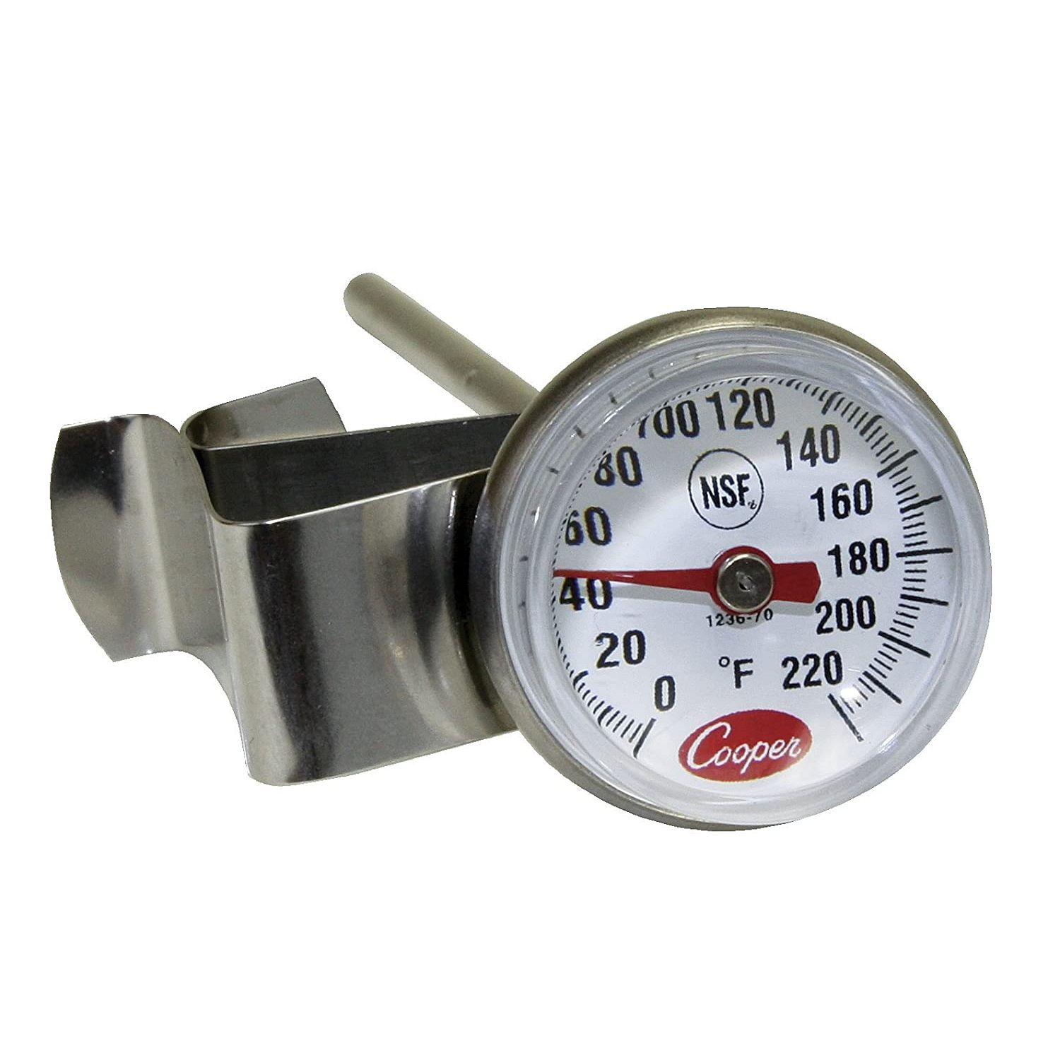 With a temperature range of 0 to 220 degrees Fahrenheit and clear markings on its dial, tracking the temperature is a breeze. Whether you're an espresso enthusiast or a seasoned barista, the Cooper-Atkins 1236-70-1 Bi-Metals Espresso Milk Frothing Thermometer with Clip is an essential tool for consistently achieving flawless milk froth. Upgrade your espresso game today with this reliable, user-friendly, and long-lasting thermometer.