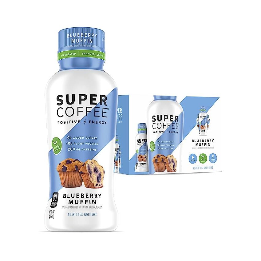 Introducing Blueberry Muffin Super Coffee - a heavenly combination of coffee and protein in one convenient bottle. With a total of 12 bottles per pack, each bottle is jam-packed with 200mg of invigorating caffeine, 10g of nourishing plant-based protein, and absolutely no added sugar. Perfectly suited for individuals committed to a low carb, high protein diet, this delightful beverage allows you to savor the delectable taste of freshly baked blueberry muffins guilt-free. Infused with MCT Oil and plant-based protein, this iced coffee serves as a healthier alternative to jumpstart your day. Unlike other bottled coffees, Super Coffee prioritizes your well-being by utilizing monk fruit and stevia to achieve a natural sweetness, thereby preventing any sugar crashes. With its screwable cap, you can conveniently take this energizing drink along wherever you go, ensuring you stay energized throughout the day. Recognized for its positivity-driven approach and dedication to providing a healthier coffee alternative, Blueberry Muffin Super Coffee has received wide acclaim, even gaining recognition on the popular show Shark Tank. Join the movement and experience a day filled with positivity and delightful flavors by fueling yourself with Blueberry Muffin Super Coffee. Description by ChatGPT.