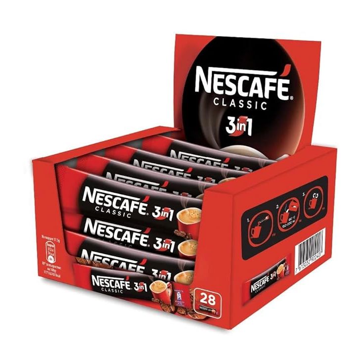 Discover the delightful convenience of Nescafe 3in1 Classic, a popular European import coffee product. Each 28x18g box contains a collection of perfectly balanced sachets, offering a quick and hassle-free way to enjoy a delicious cup of coffee.