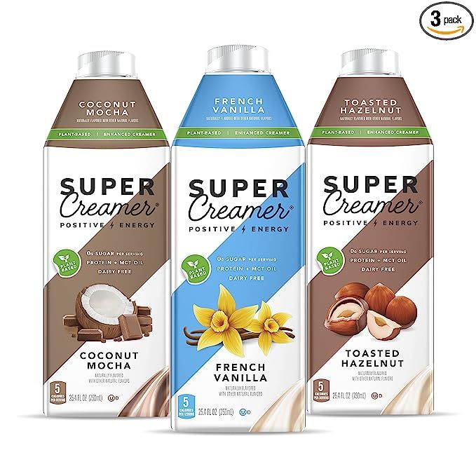Enhance your coffee experience with Super Coffee Plant Based Keto Coffee Creamer, a delicious and nutritious blend that satisfies your taste buds and supports your health. This vegan creamer is free from added sugar, boasts 1g of plant-based protein, and contains just 5 calories per serving. Conveniently packaged in a variety pack of three 25.4 fl oz bottles, you can easily enjoy it at home or on the go.
