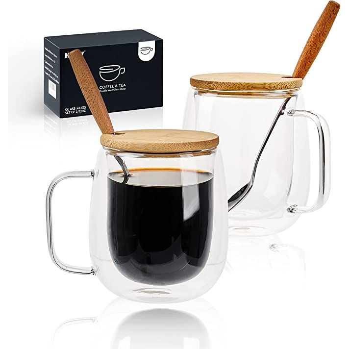 Glass 12 oz Espresso Cups with Lids and Spoon - Clear Coffee Mugs with Insulated Double Wall - Sturdy Coffee Cups for Americano, Lattes, Tea (Set of 2, Gift Box)
