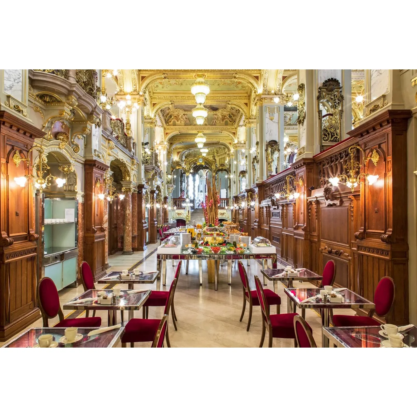 The New York Café boasts an ambiance that transports diners to a bygone era with its romantic and opulent interior. Picture this: a grand setting where guests are serenaded by the melodious notes of a live orchestra, adding to the establishment's charming allure. This esteemed café is set in a prime location that's easily accessible to all, beckoning patrons with the promise of a delightful culinary experience.