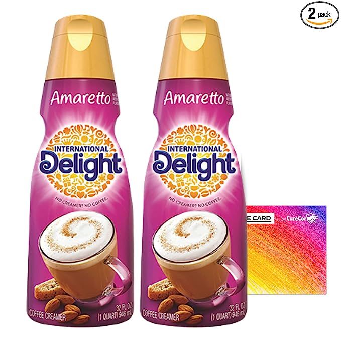 Bundle of Coffee Creamer. Includes Two (2) 32 fluid ounce bottles of International Delight Liquid Coffee Creamer and One Genuine CureCor Collective Sticker! (Amaretto)