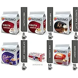 Experience a diverse selection of hot beverages with the TASSIMO T Discs Pods Coffee Latte Cappuccino Americano Cadbury Hot Chocolate Variety Box Set. Perfect for households, offices, or individuals who enjoy a wide range of hot drinks, this box set includes 56 cups of deliciousness.