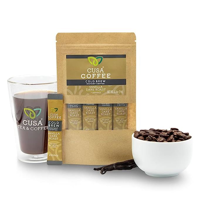 Cusa Tea & Coffee | Premium Instant Vanilla Dark Roast | Rainforest Alliance Certified Arabica Beans | Hot or Cold Brew Drink Mix Packets (7 Single Servings)