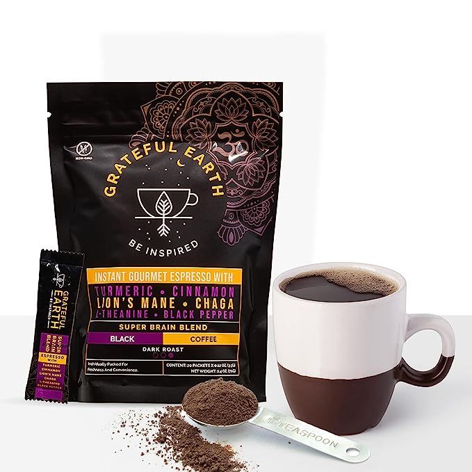 Unleash your full mental potential with Grateful Earth: Super Brain Blend Instant Gourmet Espresso. This irresistible coffee product fuses nootropics and tantalizing spices, bringing you an unparalleled coffee experience. Embrace the health benefits of turmeric, cinnamon, and black pepper, and enjoy the convenience of single-serve packets, making it easy to savor a cup of coffee on-the-go. Elevate your coffee experience and enhance your overall well-being with every sip. Description by ChatGPT.