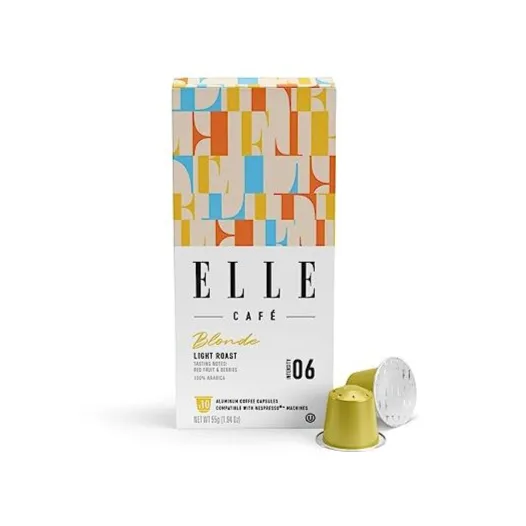 ELLE Café Blonde Premium Coffee Pods 100 Count (Pack of 10) Intense Level: 6 100% Arabica Coffee Keurig-Compatible ELLE Fashion Café Coffee Portfolio Featuring hints of Red Fruit & Berry Single-Serve Coffee Pods