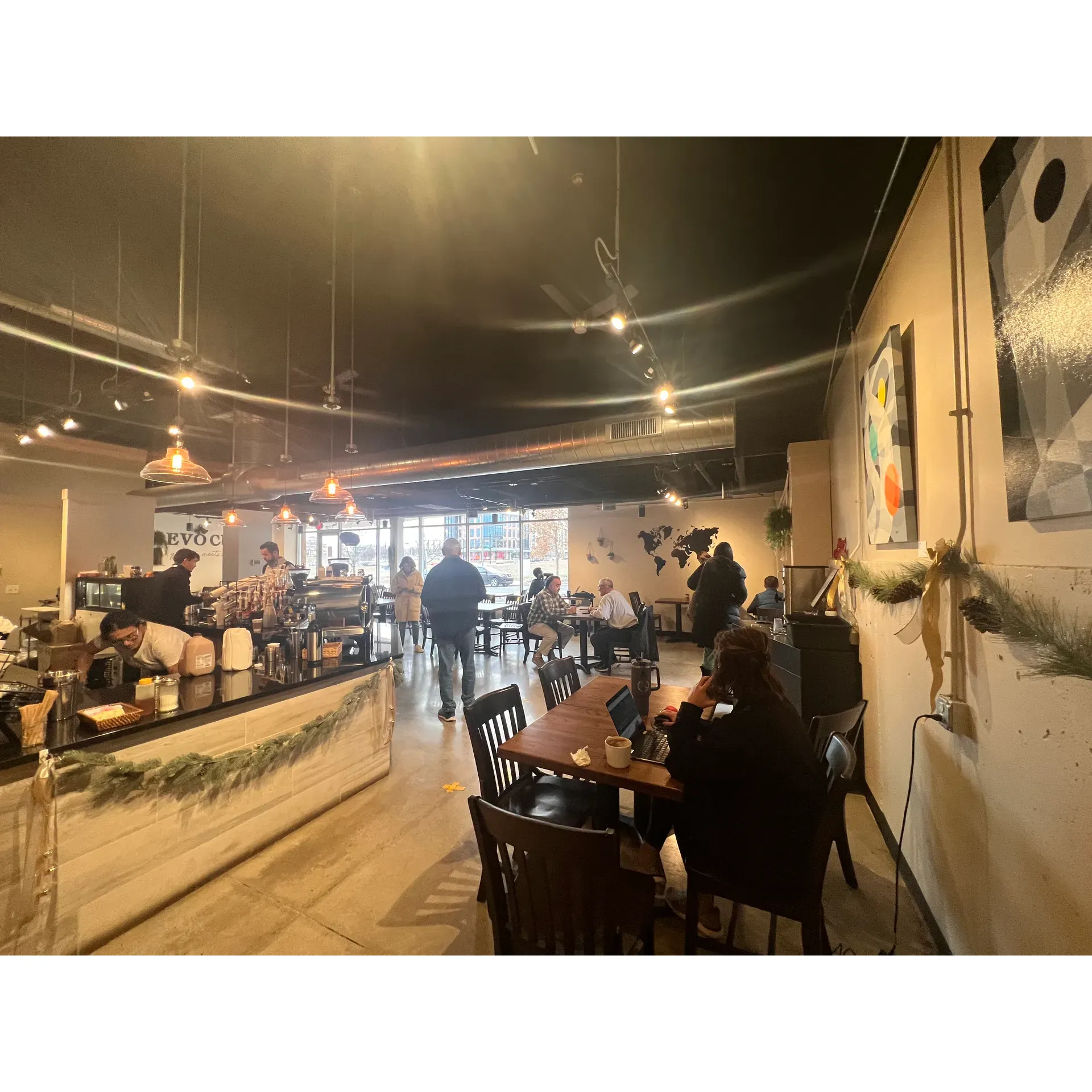 The inviting atmosphere is versatile to suit your needs, whether you are focusing on remote work, diving into a good book, or collaborating on a project. With ample seating options, you will find a cozy corner that feels just right, all set against the backdrop of soothing music that enhances the coffee shop's warm ambiance.