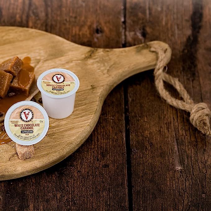 Introducing the exquisite Victor Allen's Coffee White Chocolate Caramel Flavored Cappuccino Mix - a heavenly combination of white chocolate and caramel flavors. Savor the delightful essence of smooth white chocolate merged with the sweet richness of caramel in every sip. This delectable beverage is conveniently packaged in a 42-count box of single serve cups, specially designed for use with Keurig K-Cup brewers. Prepare a steaming cup of flavorful cappuccino effortlessly by inserting a cup into the brewer and selecting your desired size. Say goodbye to messy cleanups and complicated brewing processes. Victor Allen's Coffee guarantees the highest quality in each cup, ensuring a rich and indulgent coffee experience every time. Customize your drink with milk, whipped cream, or cocoa powder to enhance the white chocolate caramel flavor. Elevate your coffee routine with the Victor Allen's Coffee White Chocolate Caramel Flavored Cappuccino Mix - the perfect blend of convenience, versatility, and unparalleled taste.